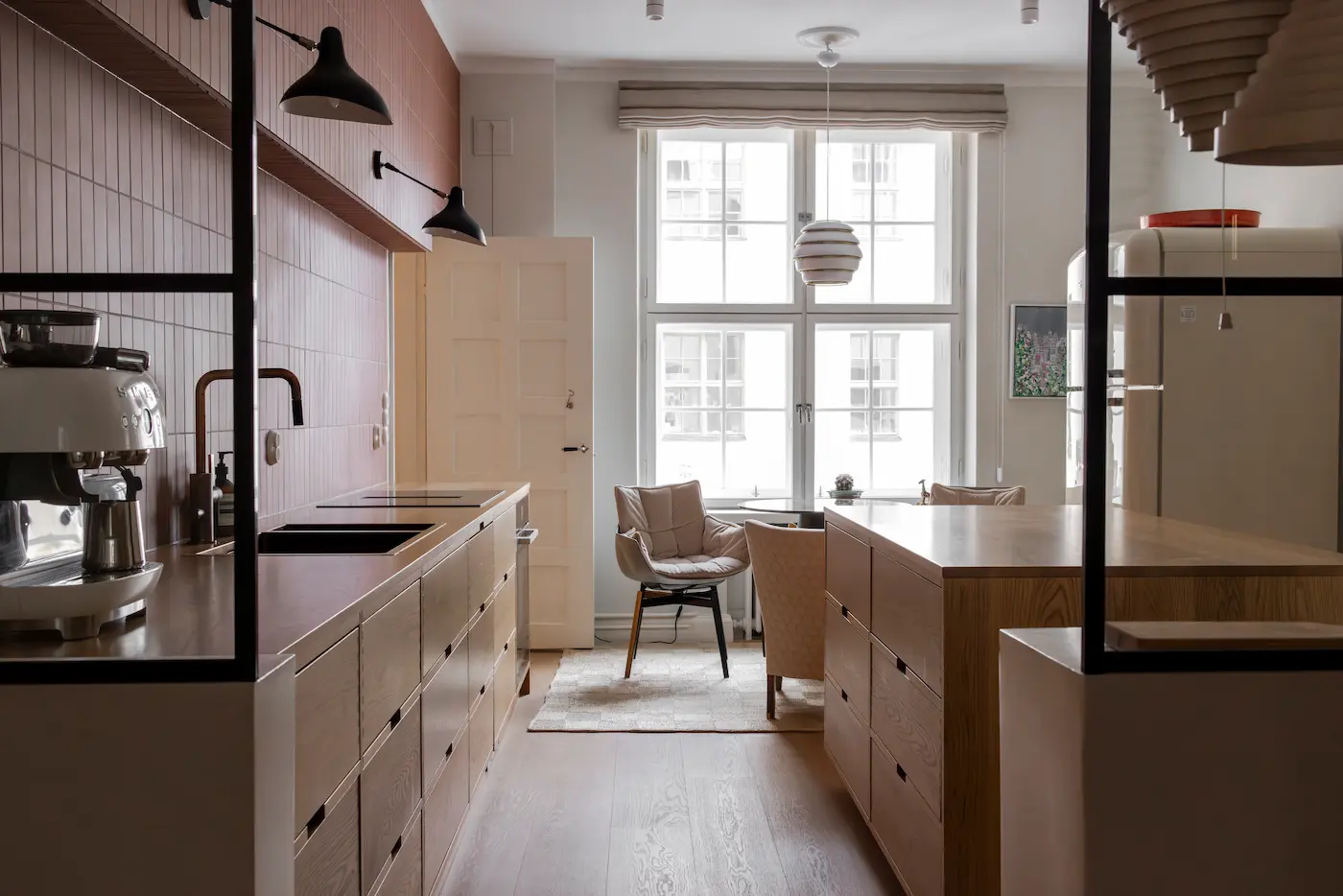 This kitchen was built with millimetre precision to fit a small kitchen. The drawers were handcrafted with finger joints – a detail that speaks to quality and traditional craftsmanship. Noteworthy are also the continuous wood grains on the drawer fronts, flowing seamlessly from one drawer to the next. The result is a practical and clean-lined kitchen where the mark of craftsmanship is clearly present.