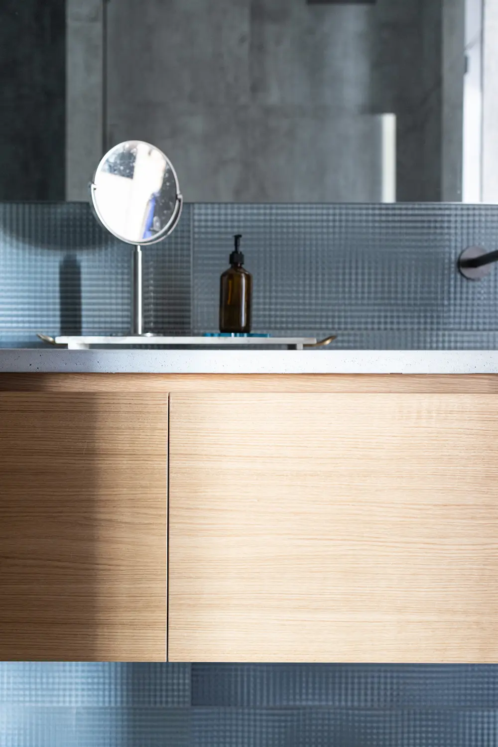 A custom-made bathroom cabinet in oak veneer. The stone countertop adds ease of use, and the drawers enhance functionality. It is a stylish and practical solution for a small space.