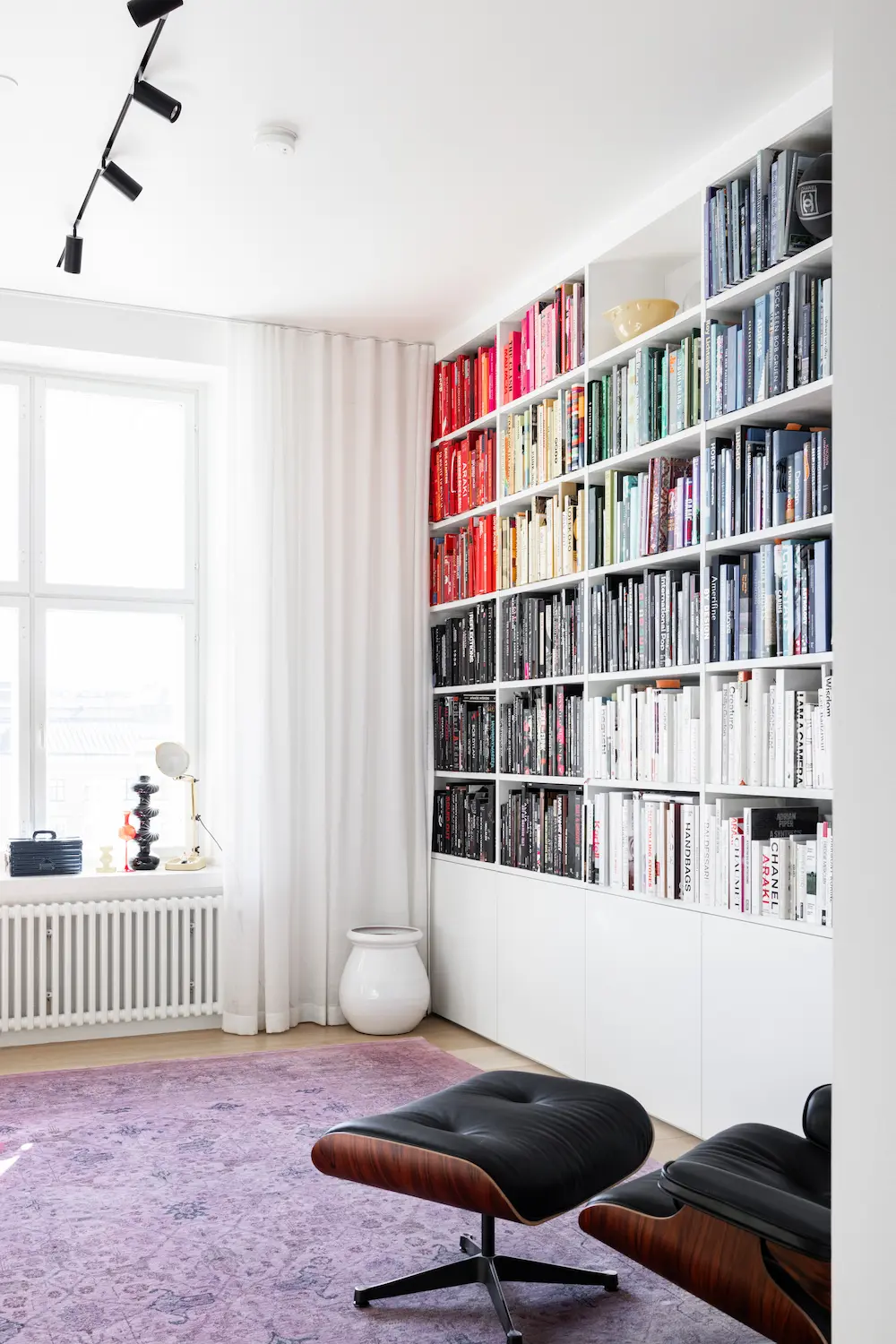 Designed for a reading room, this large-scale bookshelf spans the entire wall. The upper part is open for books and decor, while the base features custom cabinetry to keep things organized and out of sight.
